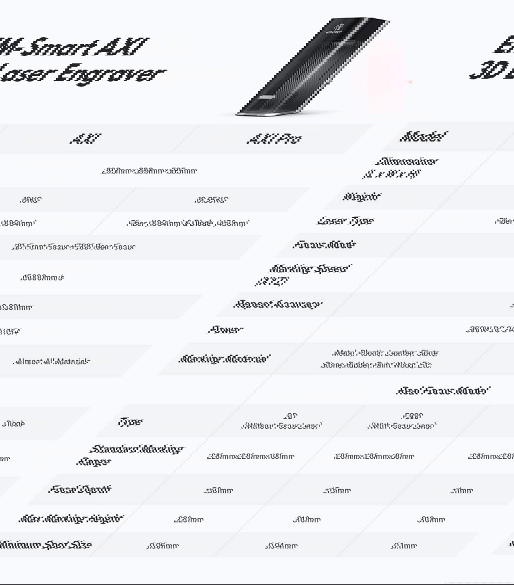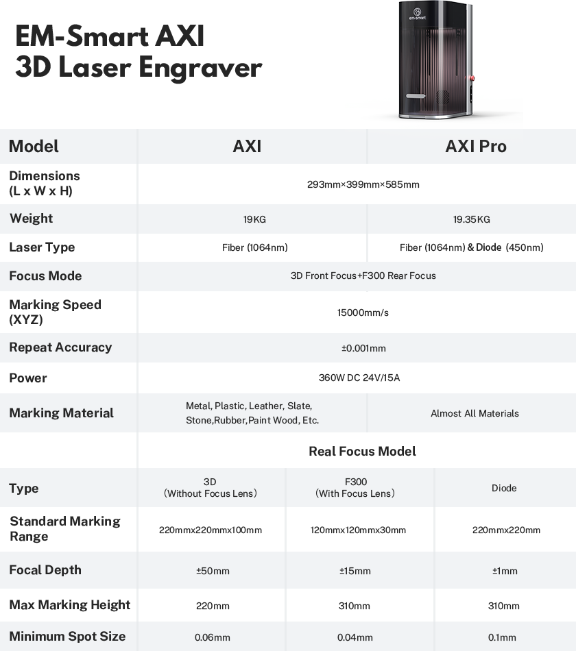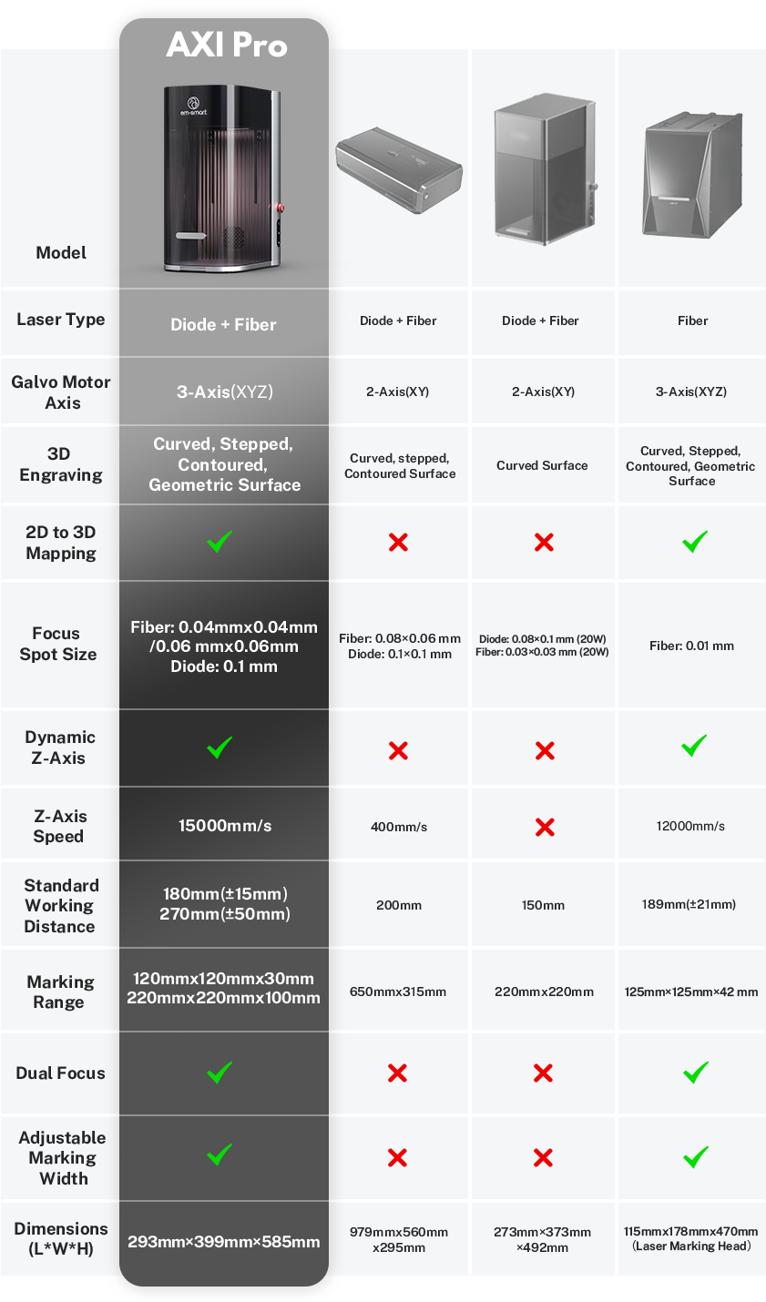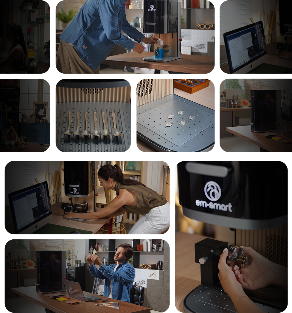 A true 3D laser engraver, built for complex surfaces and limitless materials. With 2D-to-3D mapping and a dual-laser system (Fiber + Diode) , EM-Smart AXI Series brings industrial-grade precision and speed into a compact desktop form. A new era of creation is here.