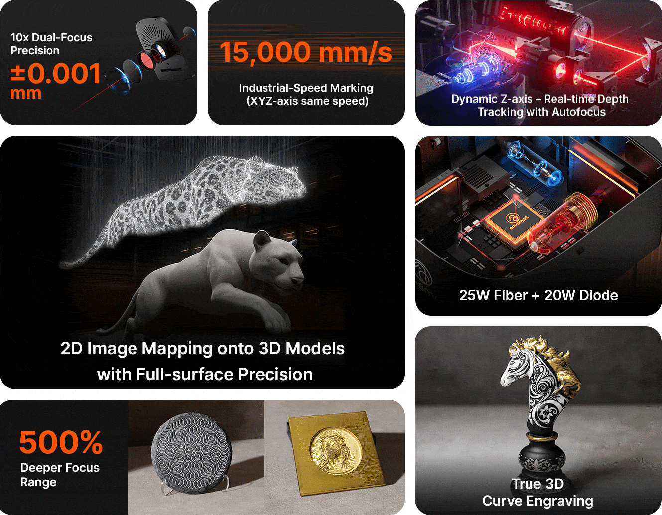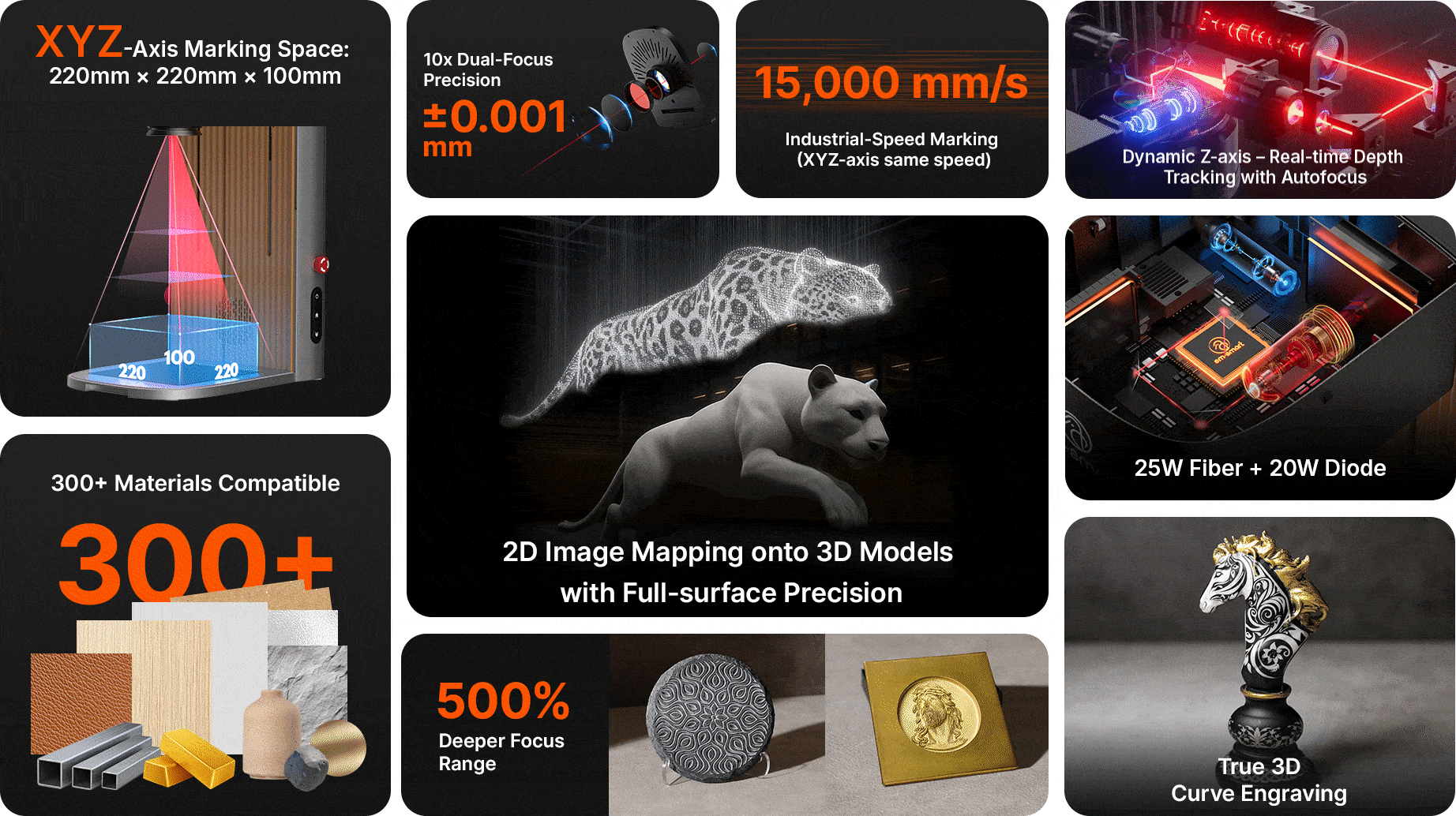 From curves to contours, AXI keeps perfect focus and energy consistency across a full 220×220×100mm 3D engraving space.